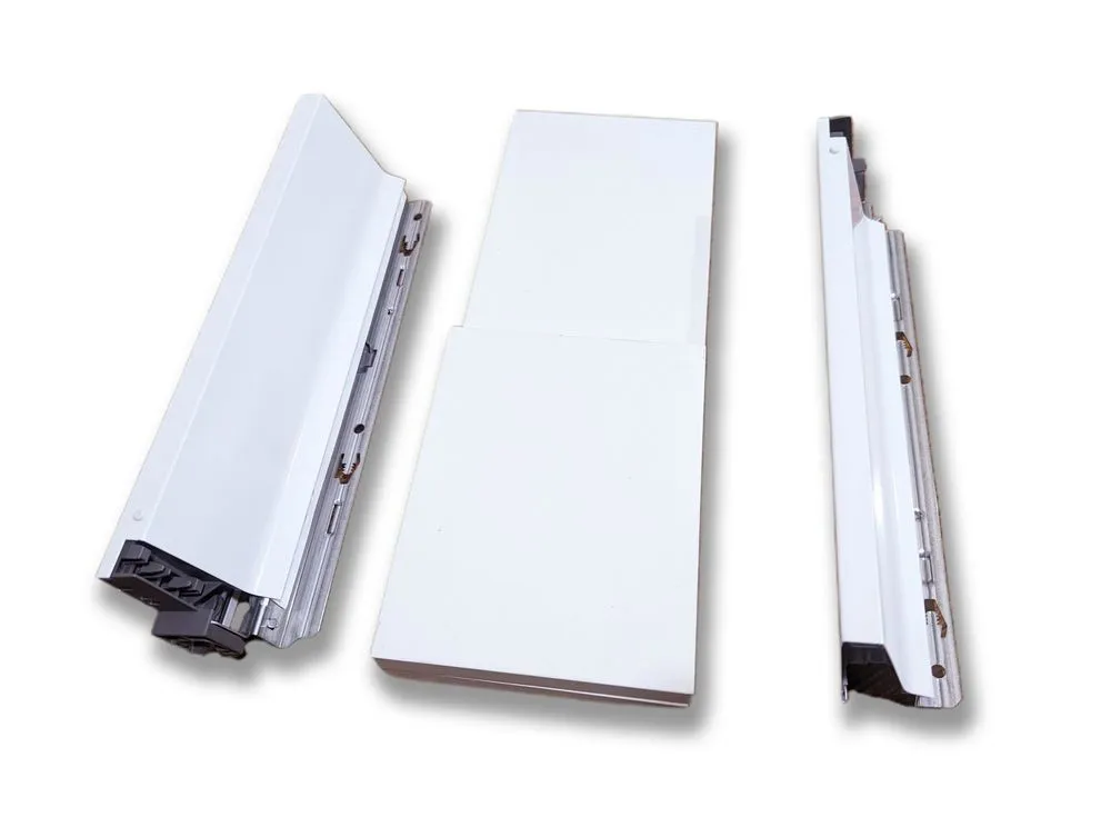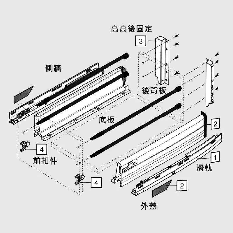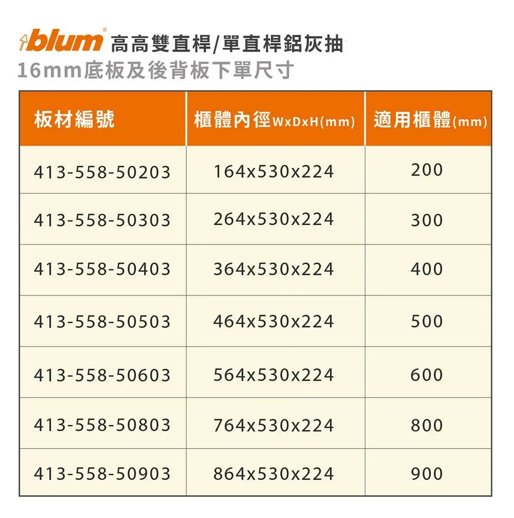 blum高高雙直桿/單直桿鋁灰抽滑軌 配件/尺寸(點擊圖片放大) 413-16mm板材一覽 產品介紹: 材質:16 mm板材顏色:白色/淺銀灰色甲醛等級:E1尺寸:櫃體外徑寬度 200 / 300 / 400 / 500 / 600 / 800 / 900 mm 注意事項: 1.需搭配 blum 金屬抽(如:鋁灰抽、安拉抽、帝寶抽)一起訂購。 2.下訂時,需告知櫃體寬度外徑及內徑尺寸,交期需7-10個工作天 灰色 白色 ※ 需訂製板材時,請記得告知櫃體外徑寛度呎吋及實際內徑寛度呎吋