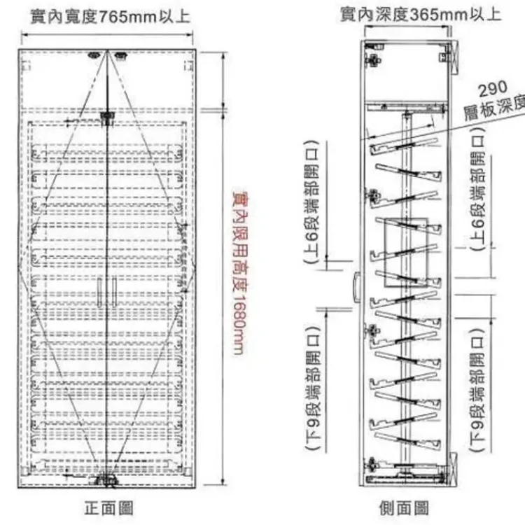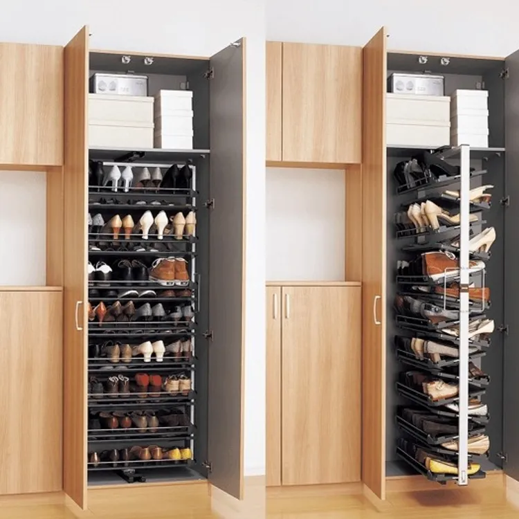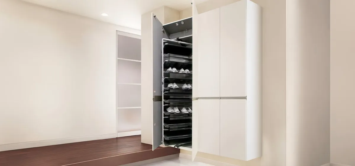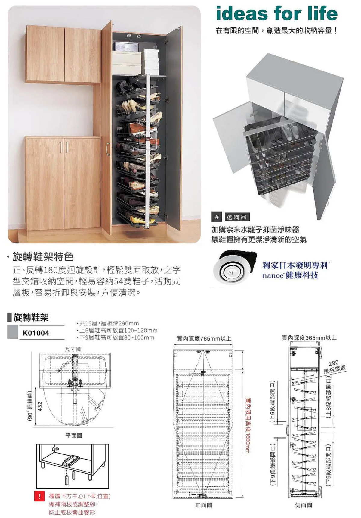 日本國際牌Panasonic(松下電工)原裝進口鞋架,櫃內安裝之旋轉式鞋架設計,採用正旋轉&逆旋轉180°兩面收納,搭配側拉式滑軌,可將鞋架完整拉出並旋轉至使用位置,讓收納與取用更加直覺便利。整體以金屬材質製成,結構穩固耐用,適合應用於玄關鞋櫃或系統收納櫃中,有效提升空間利用率與整體整潔度。層板可自由拿出清洗,高統靴或高跟鞋也能輕鬆置放。 櫃內內徑: 765x365x1680mm (不含櫃體及門片)。收納數量: 54雙鞋。單片層板可承重: 3kg耐用次數為30,000回