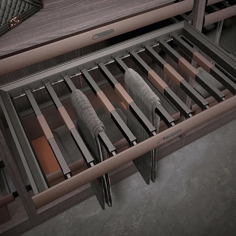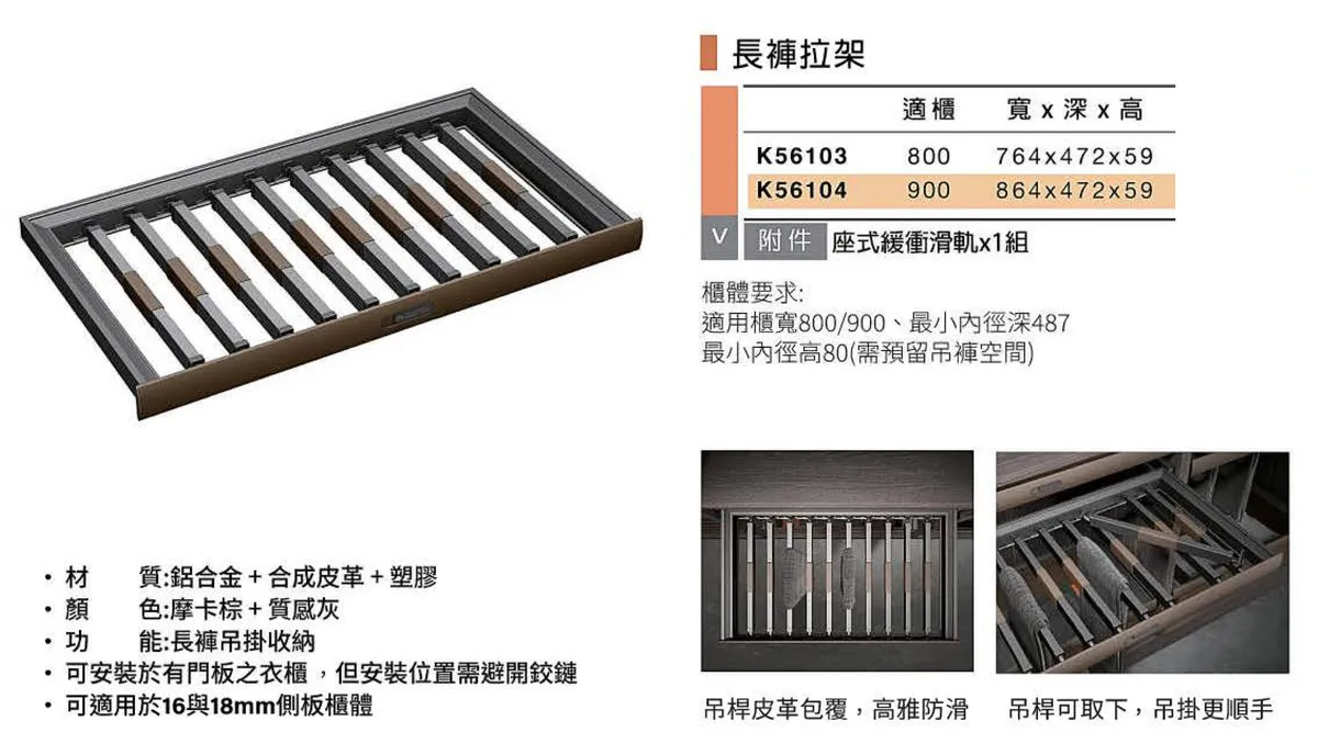 | 材質:鋁合金、合成皮革、塑膠 顏色:摩卡棕+質感灰 功能:長褲吊掛收納 ·可安裝於有門板之衣櫃 ,但安裝位置需避開鉸鏈 ·可適用於16與18mm側板櫃體 ·吊桿皮革包覆, 高雅防滑 ·吊桿可取下,吊掛更順手 |