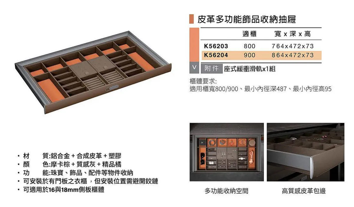 | 材質:鋁合金、合成皮革、塑膠 顏色:摩卡棕+質咸灰+精品橘 功能:珠寶、飾品、配件等物件收納 ·可安裝於有門板之衣櫃 ,但安裝位置需避開鉸鏈 ·可適用於16與18mm側板櫃體 ·多功能收納空間 ·高質戚皮革包邊 |