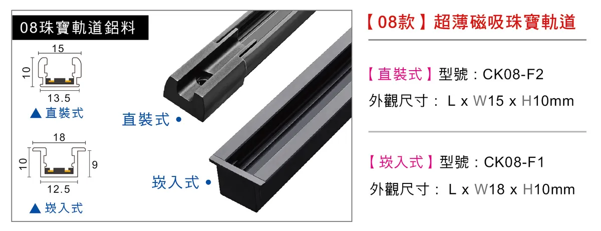 【直裝式】型號 : CK08-F2尺寸 : L x W15 x H10mm【崁入式】型號 : CK08-F1尺寸 : L x W18 x H10mm材質 : 鋁合金