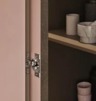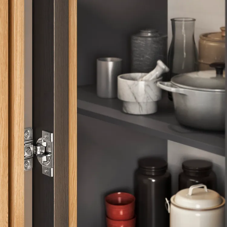 blum 內推門緩衝鉸鍊(Inward Opening Furniture Door)-- 鉸鍊本身內建 BLUMOTION 緩衝效果,透過特殊安裝方式,使門片可向內推開,突破傳統鉸鍊僅能外開的限制,為空間設計帶來更多可能性。建議應用於門片寬度 900mm 以下之傢俱櫥櫃內開門設計,門片最大開啟角度約 95°,兼顧機能與使用順暢度。