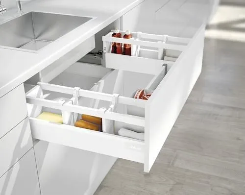 豪華金屬方桿抽屜的滑軌同樣是搭配BLUMOTION 緩衝阻尼,抽屜拉開時,滑順平穩,抽屜關閉時,輕柔緩衝安靜。使用壽命長,經過十萬次以上的開合耐用測試。不僅外型時尚美觀,更具實用性。
