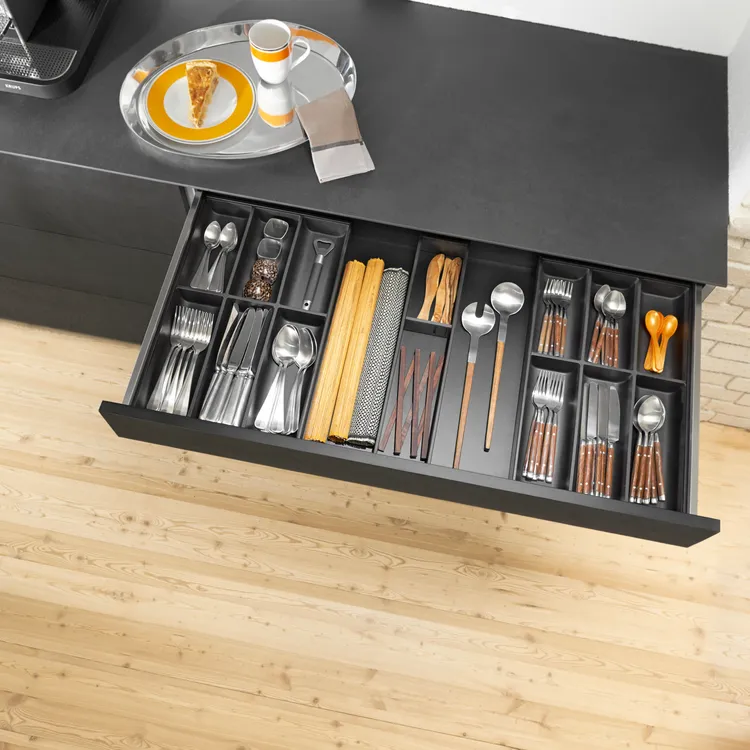 blum AMBIA-刀叉盤:blum AMBIA-LINE 一體刀叉盤,讓物品分類清晰明顯,所有物品一目了然且收納穩當。可與麗拉抽內分隔框做搭配,自由規劃出想要的空間分配,能與裁模器、刀具架、分隔框等搭配能展現出抽屜最大的靈活性與自由性。產品優點:1. 外型質感佳,靈活性高。2. 為您打造井然有絮的儲藏空間。 應用範例 相關影片