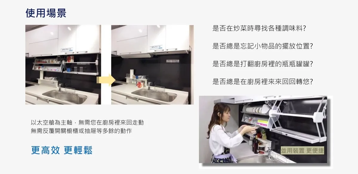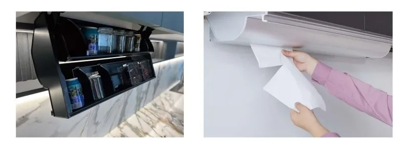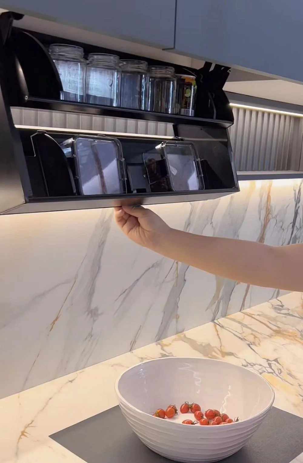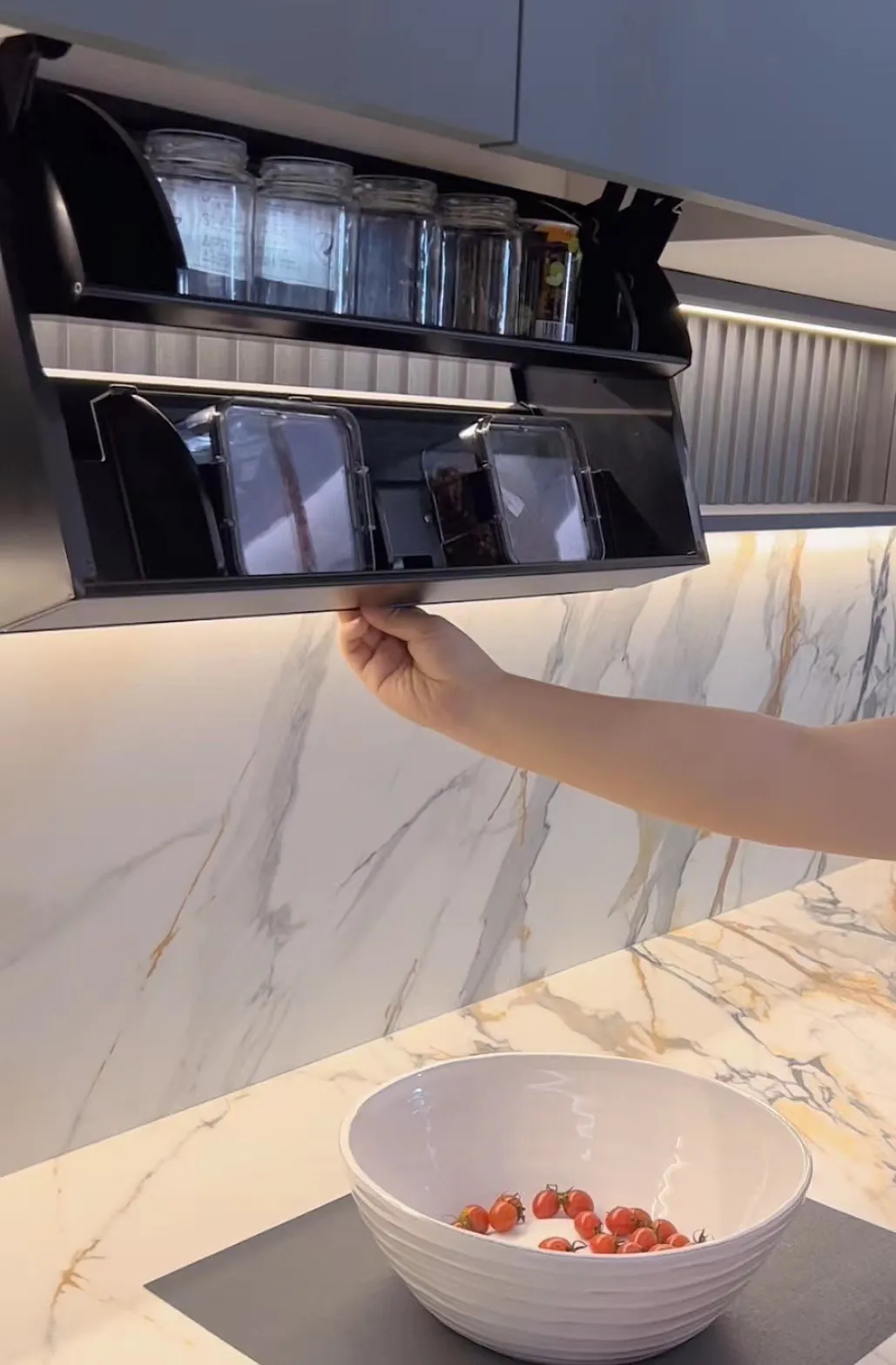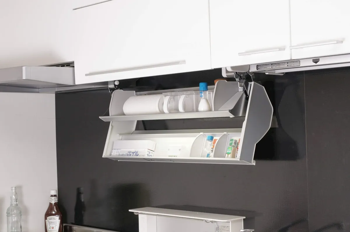 將其安裝於視線高度(即站立時平視),取物非常方便。不使用時,將罐架收納回櫥櫃下方,既實用又美觀。