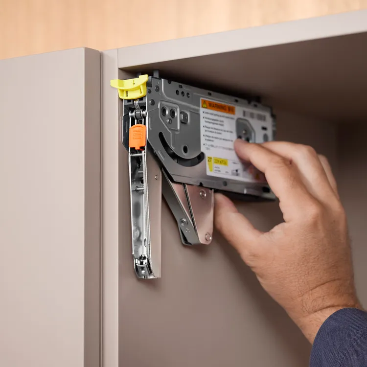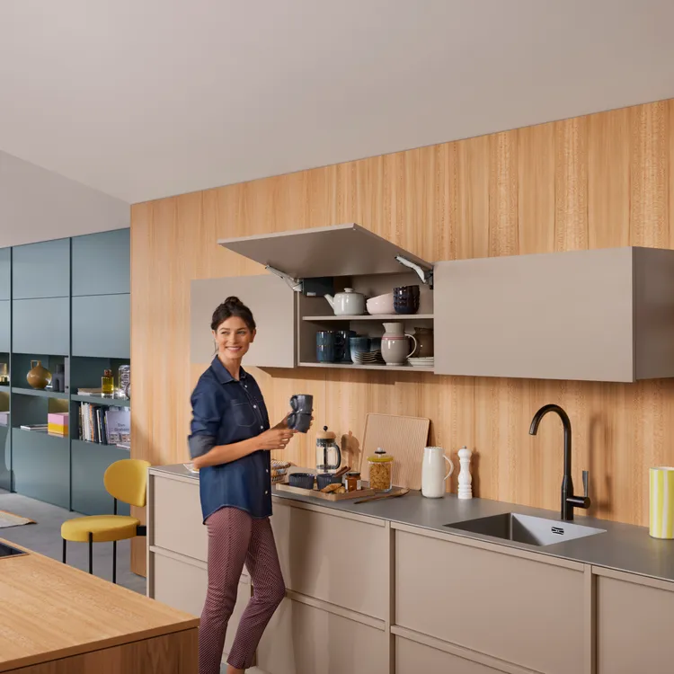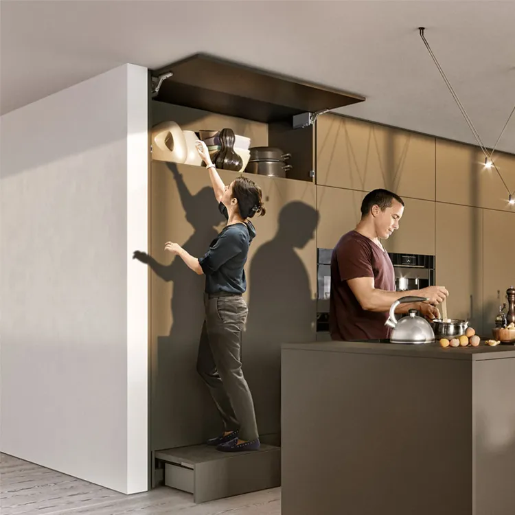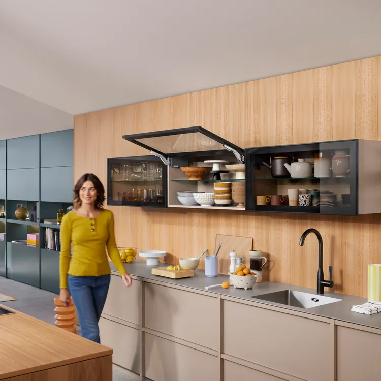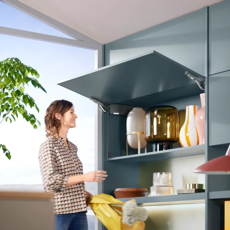 Blum AVENTOS HK 上掀門無需用力即可輕鬆開啓與關閉。隨意停掀的特點,使面板可任意停頓,讓您輕易取物。即使門片較重,關閉力度大時,也能緩衝無聲操作,無需擔心夾手及噪音問題。門板不用另外加裝西德鉸鍊,鉸鍊緩衝與撐桿作用為一體,結合您的實用與設計創意。