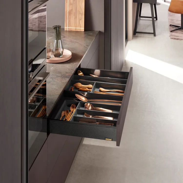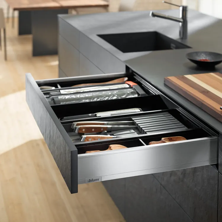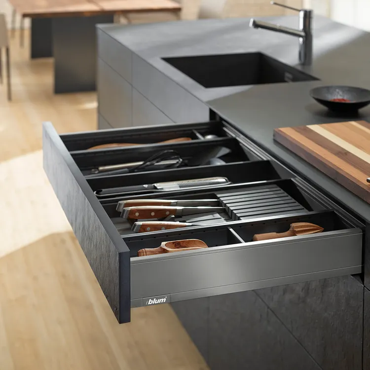 作為一種設計元素,高面板越來越重要。為了迎合這種設計趨勢,LEGRABOX 超薄麗拉金屬抽屜系列,新的面板固定件,確保抽屜開合過程中的穩定性。