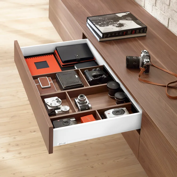 纖細的直線型設計、高質量的動感使這款優雅的抽屜系列尤為出眾。簡約的設計早已榮獲多項國際大獎。 LEGRABOX 超薄麗拉金屬抽屜就像住宅主題一樣具有多面性,適用於所有居家空間和應用範圍。全新的LEGRABOX 麗拉滑軌系統,因其為全拉式抽屜且負載能力強而備受客戶青睞。由於下垂度低,可在與距離地板在近的位置安裝LEGRABOX麗拉超薄金屬抽屜系列滑軌。有40kg和 70kg 的動態載荷,即使對於較寬而且負有重物的抽屜,滑軌也能輕盈滑動。