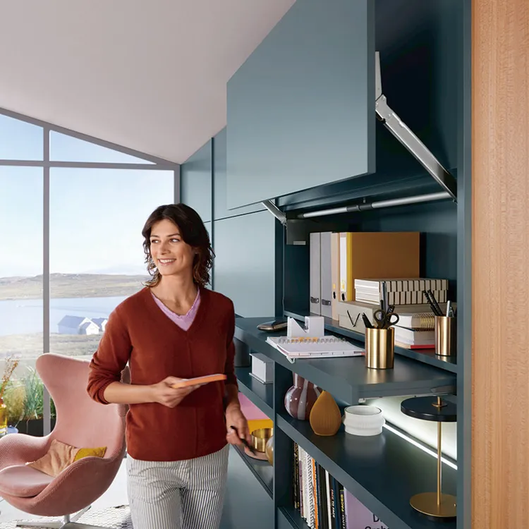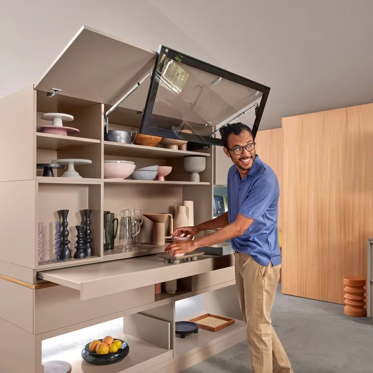 向上抬起鎖定裝置即可迅速收回層板。將層板輕鬆解鎖後便可將置物面隱藏於傢俱中。