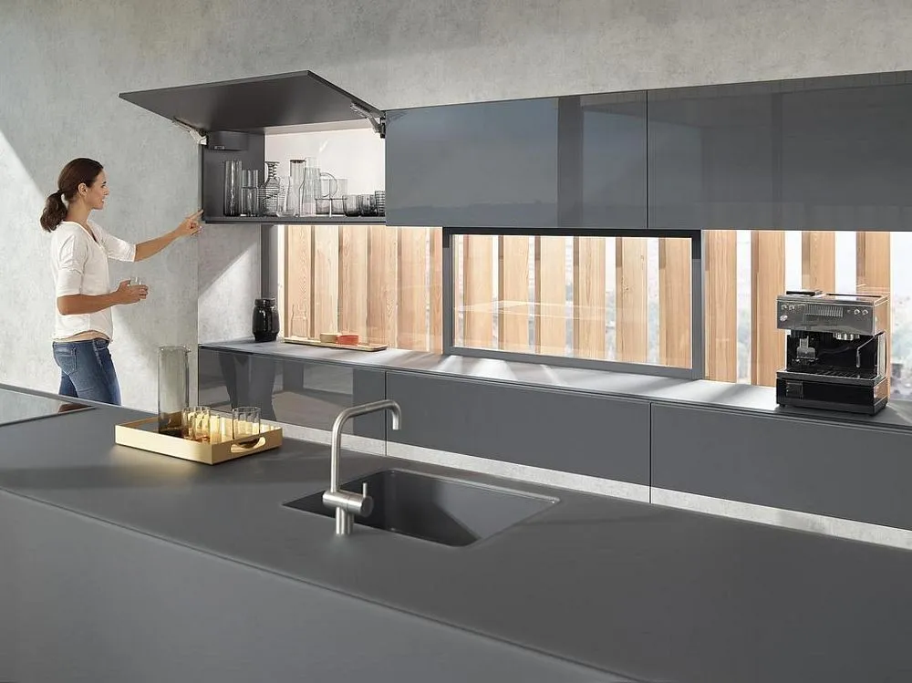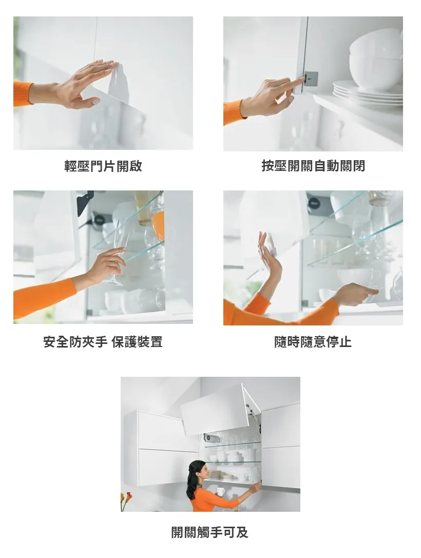輕壓開啟:只需輕輕用手或肘部按壓,就可打開面板。面板較大或較重,向上也能輕鬆打開。不僅方便了您的工作,也為廚房設計創造更多的可能性。