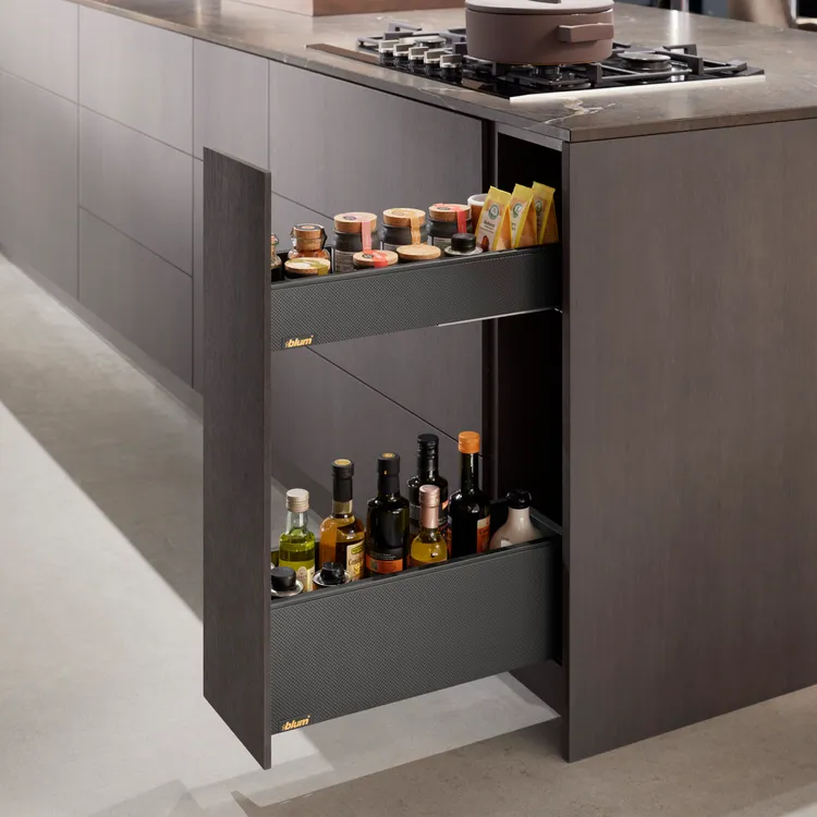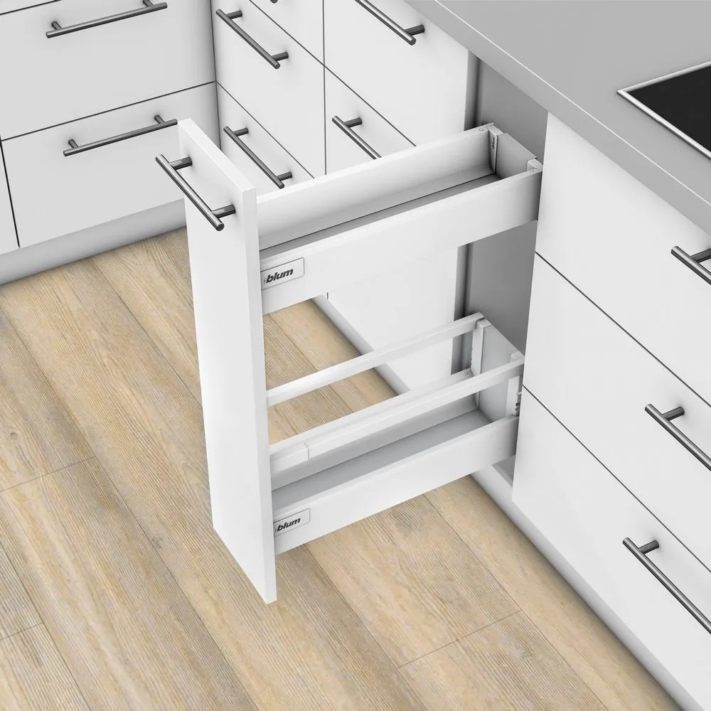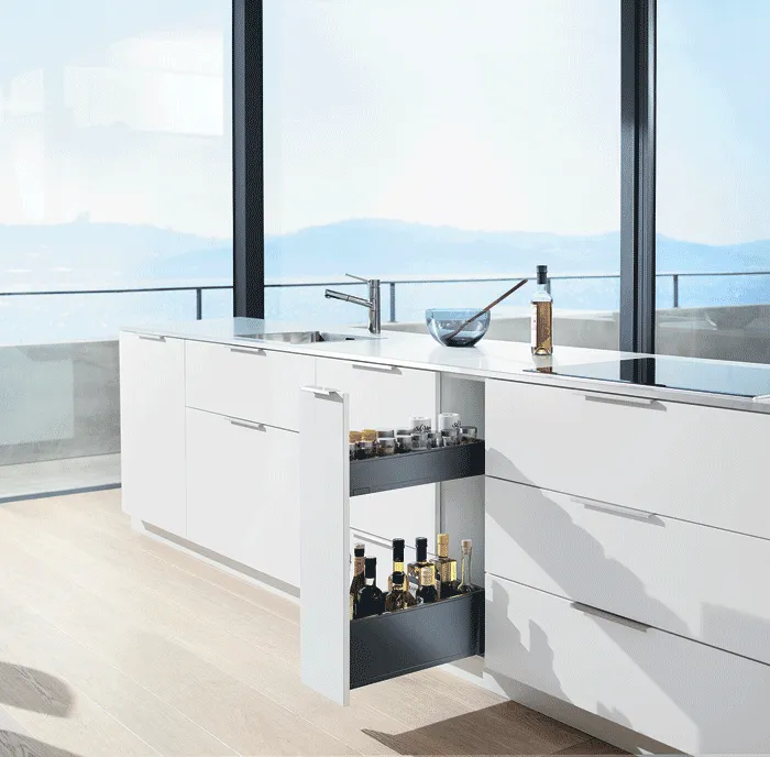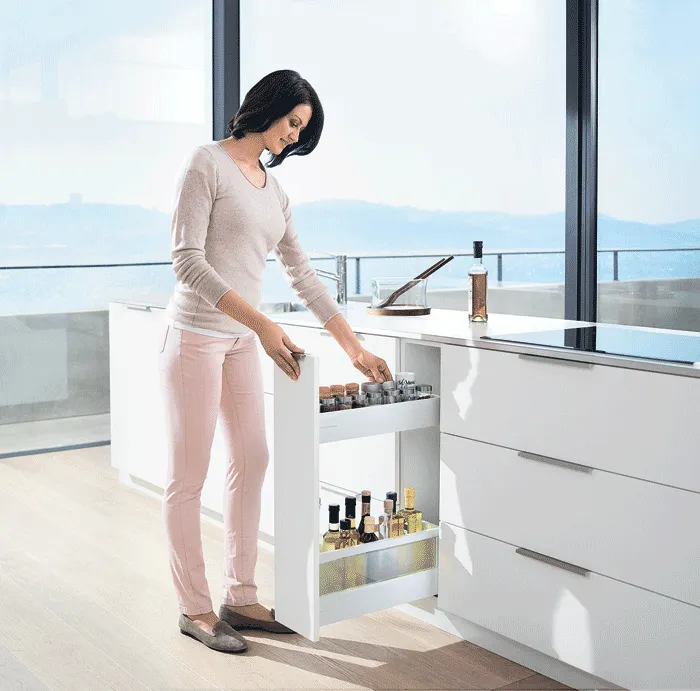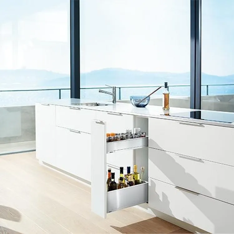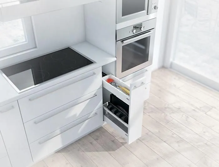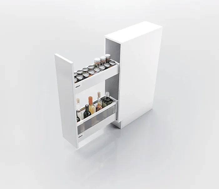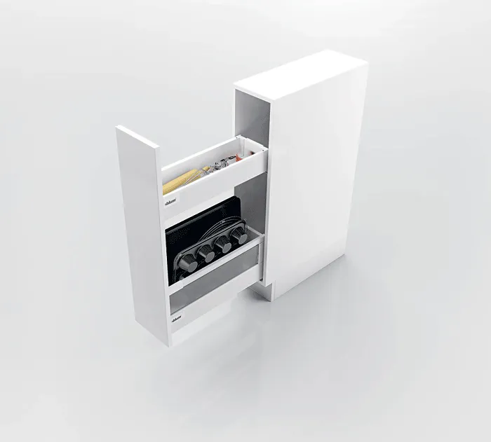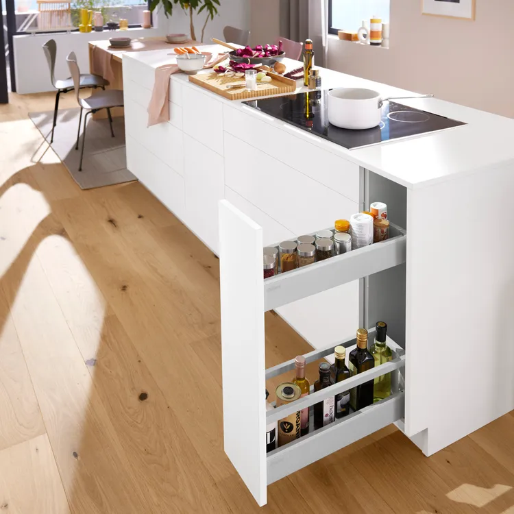 blum 針對超窄櫃體提出的創意能夠幫您利用到廚房內最狹窄的收納空間,而且您還不用放棄對穩定性和操作舒適性的追求。