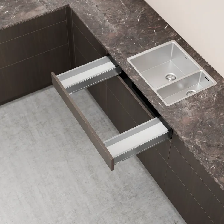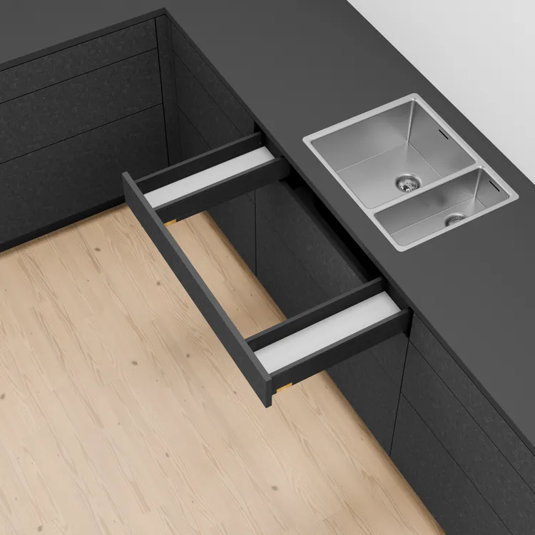作為一種設計元素,高面板越來越重要。為了迎合這種設計趨勢,LEGRABOX 超薄麗拉金屬抽屜系列,新的面板固定件,確保抽屜開合過程中的穩定性。