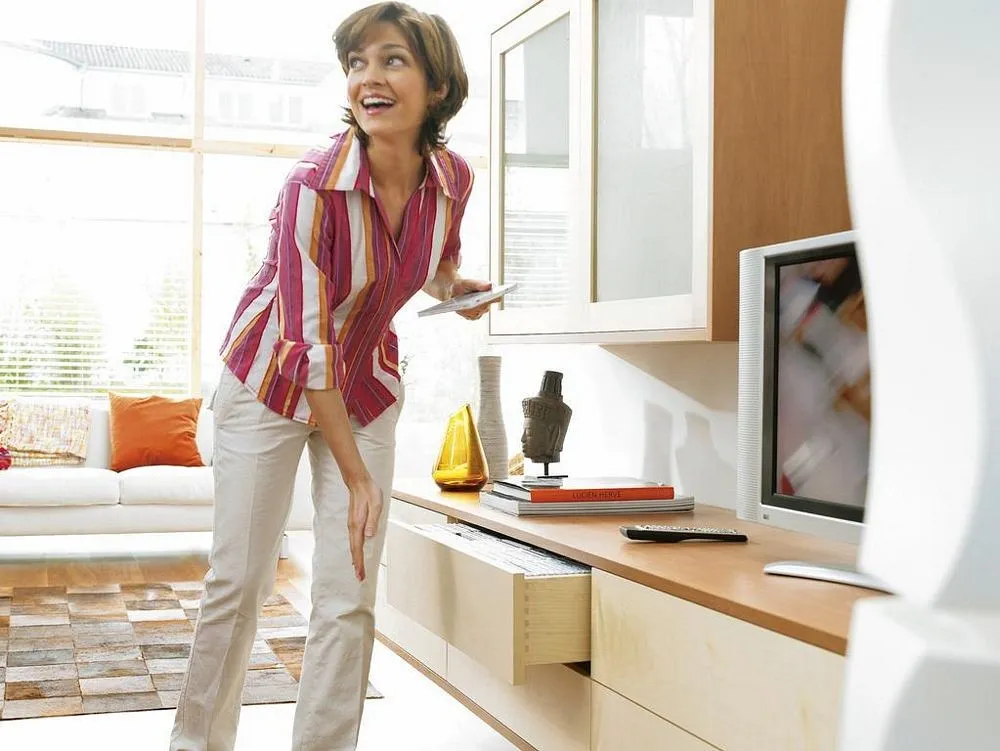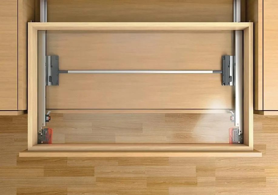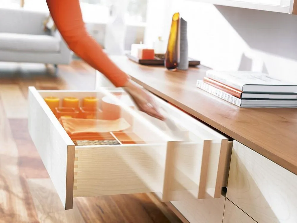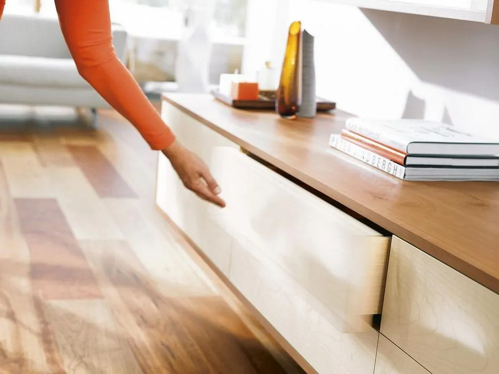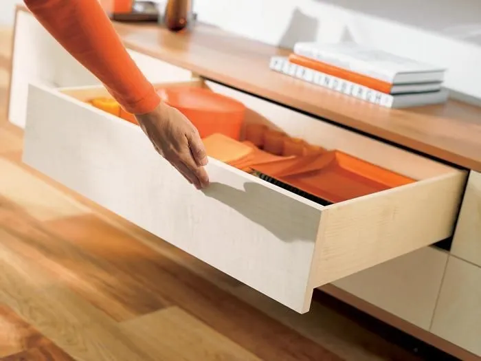 將 TIP-ON機械觸碰式開啓應用在 TANDEM 隱藏靜音木抽系列,可以豪不費力並且穩當地打開抽屜。輕觸面板的任意位置都可以,安裝大抽屜平衡桿,即使是寬面板,TIP-ON 機械觸碰式開啓的效果也能發揮出來。關閉櫃門只需輕按面板。做動行程短,彈力超強,高穩定性,低故障率,裝潢可做無把手整體造型設計,美觀實用。