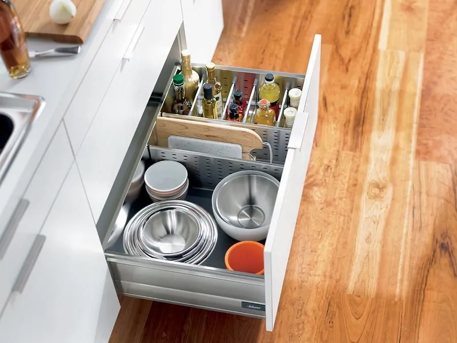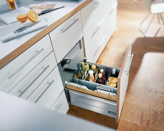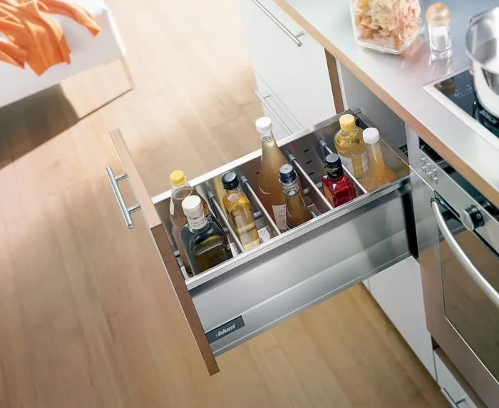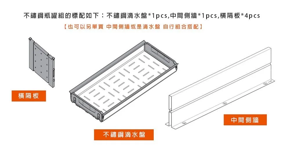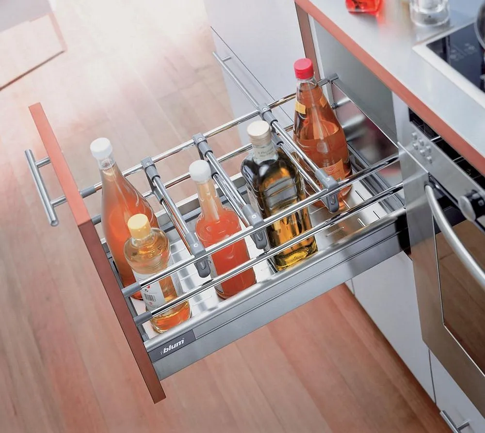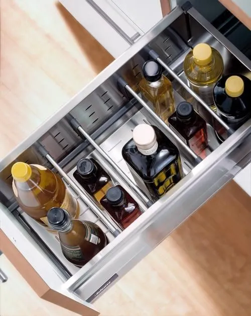 blum 瓶罐組+不鏽鋼滴水盤: 不同高度的瓶子都可在面板高抽裡安全擺放,靈活的橫隔板片能提供支撐固定,醬醋油等觸手可及,清潔衛生的瓶托盤由不鏽鋼製成,便於清潔。 產品優點: 1. 外型質感佳,能與 blum 滑軌做最佳的結合。 2. 為您打造井然有絮的儲藏空間。 3. 特殊的設計,能依需求,彈性調整隔板的大小與間隔。 4. 不論抽屜大小寬度,都能搭配使用。 5. 不鏽鋼滴水盤可取出,清潔容易。 6. 取代傳統台製小側拉籃,儲物空間更大。 應用範例 操作影片