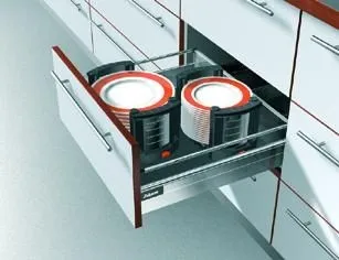 blum 全開式緩衝低抽搭配單層的圓形直桿,即變身為實用的中高抽。抽牆的側邊加高,能增加有效儲物空間,並使內容置物有側面支撐,不至外掉。另外,加上任意搭配的 blum 各種分隔配件,能達成不同的應用目的。如: 調味瓶罐抽、雜糧罐頭食品抽、搭配 blum 伸縮置盤架即為盤碟抽、搭配卷宗架可應用在辦公室、傢俱衣物櫃、醫療診所藥罐及醫院設備…等等。滑軌載重為30KG/50KG,相較於市面上一般其他品牌的鋁灰抽及拉籃滑軌,更為耐用、耐重、不易生鏽及故障。