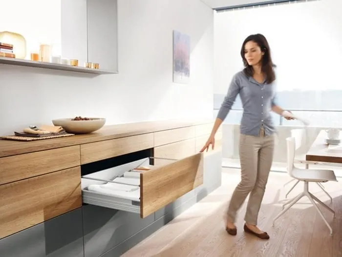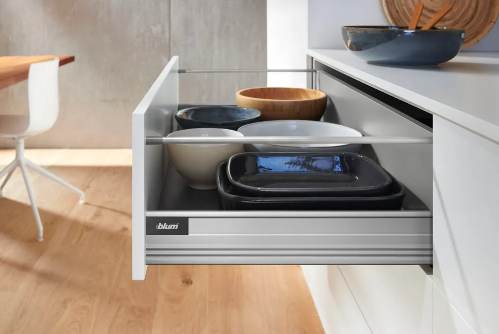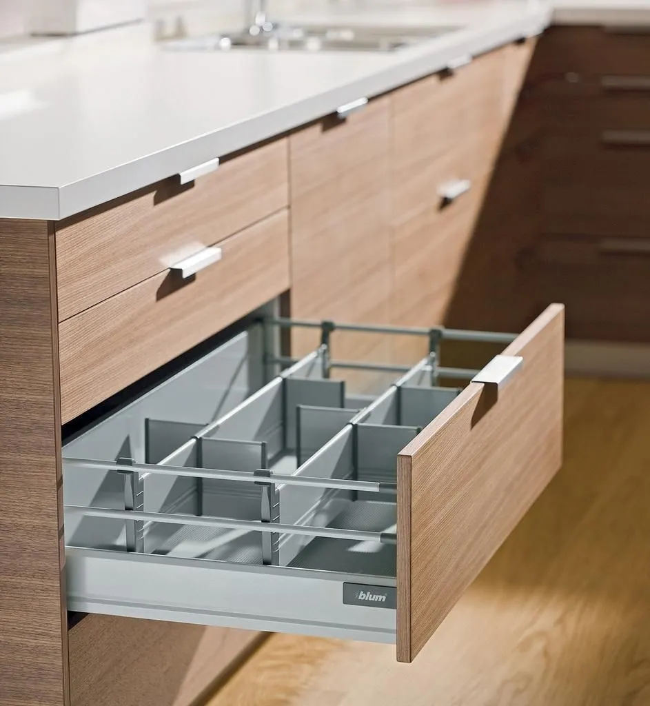 blum 的 TANDEMBOX 豪華金屬鋁灰抽滑軌,經過數百萬次的實踐證明,平穩順暢滑行的性能讓廣大客戶為之驚豔。BLUMOTION 緩衝阻尼則打造出輕柔關閉效果。完善的產品線(低抽、中抽、高高抽)和多功能內裝分隔配件,讓您能在面對客戶多樣化需求時,輕鬆找到合適的解決方案以及應用設計。