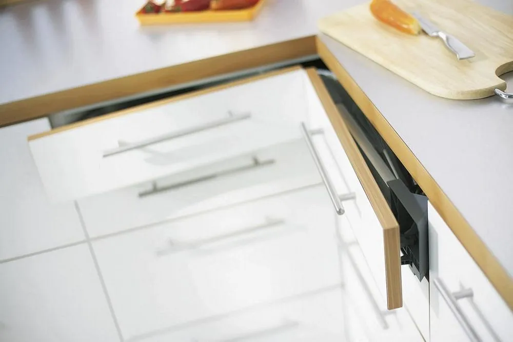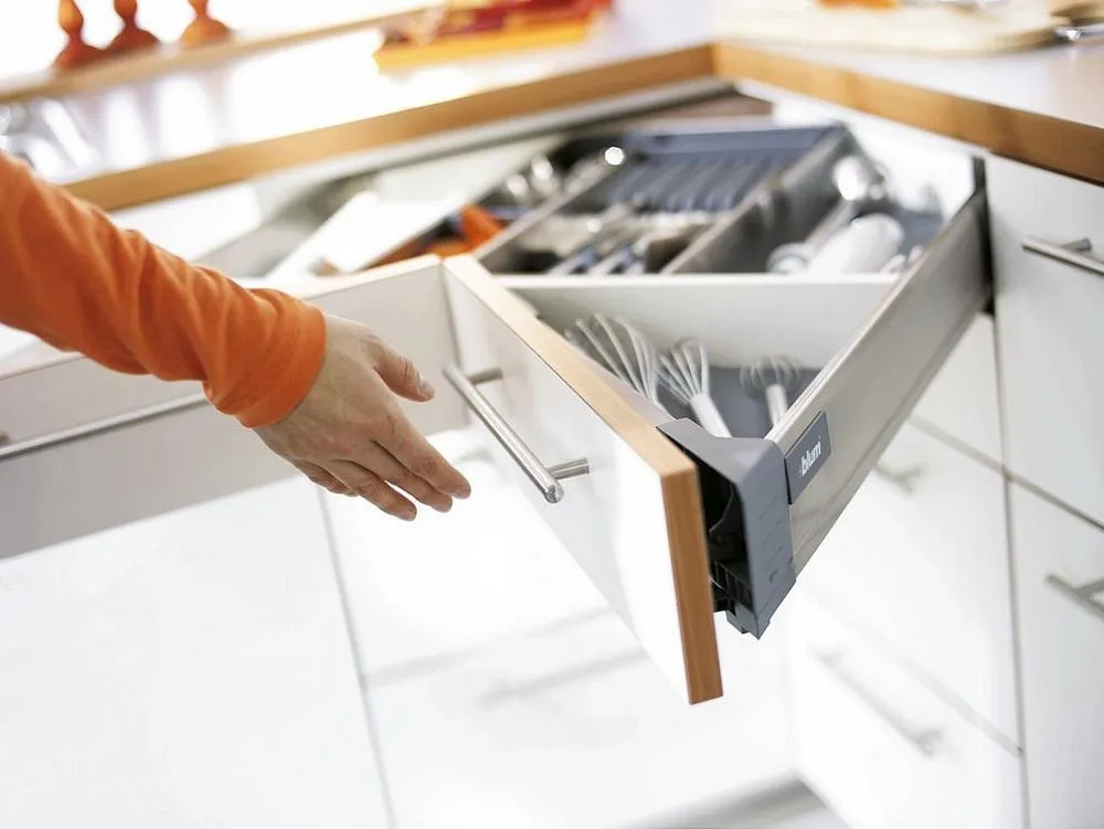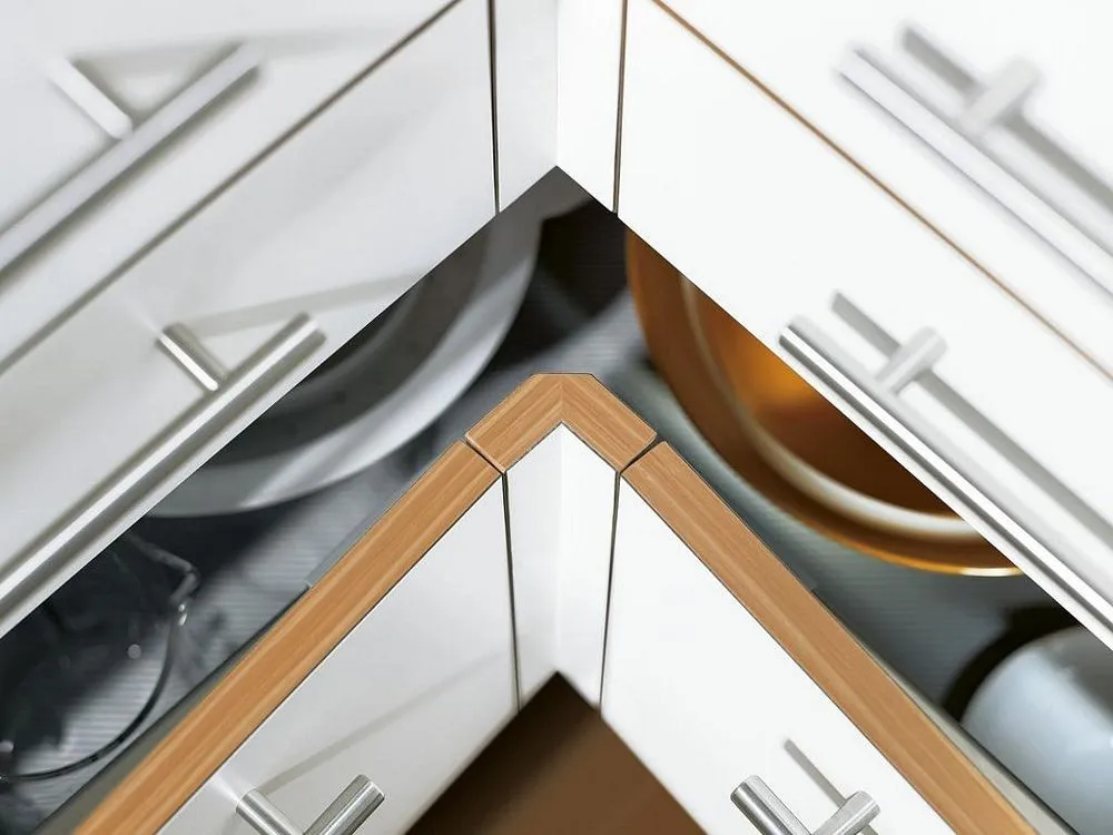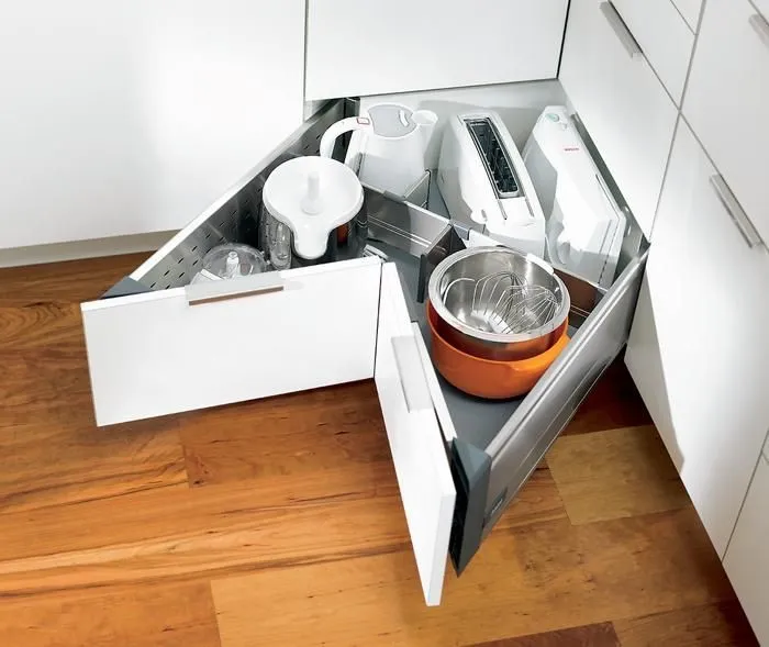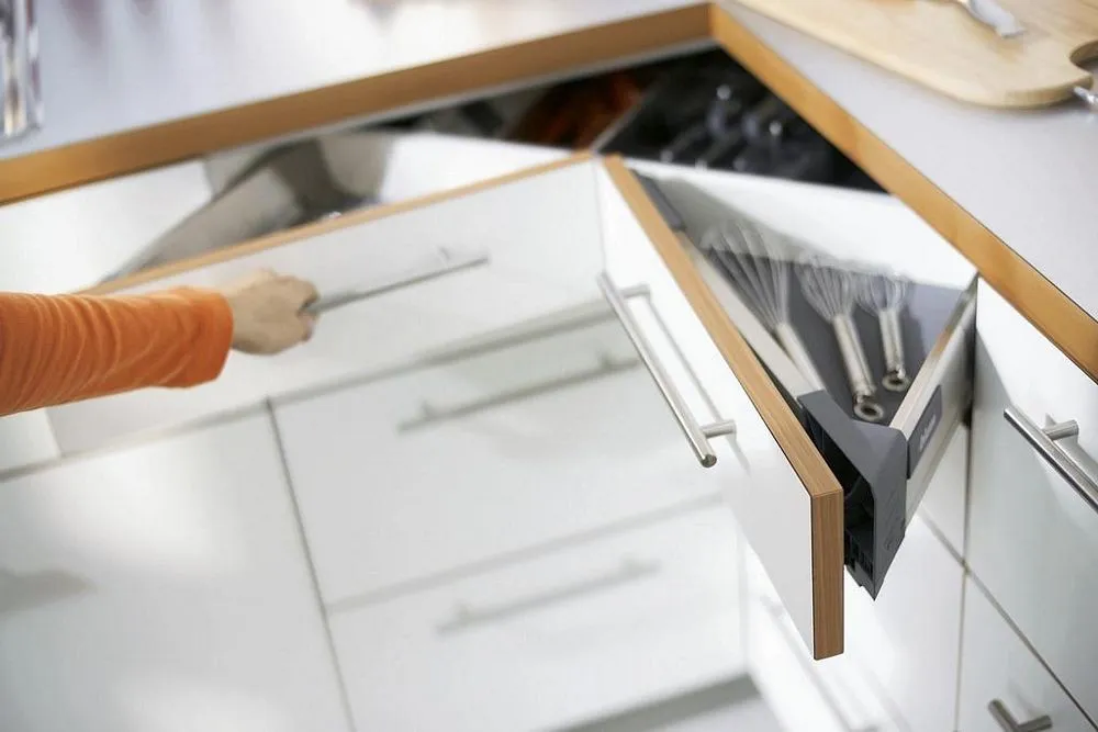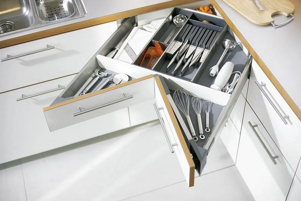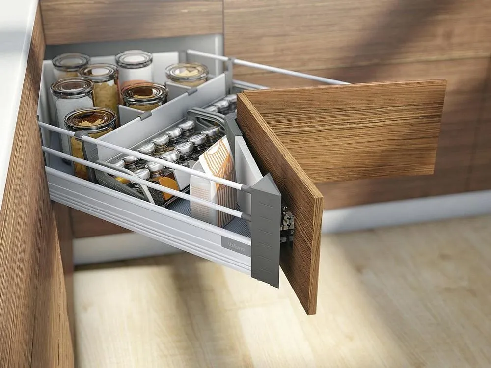 相對於傳統的角抽解決方案,我們推出了 blum SPACE CORNER 專用角抽。這樣,您就可以在角落處輕鬆而一目了然,拿取碗盤刀具(擺放在 blum 的不鏽鋼刀具架内)和各類鍋具。現有的角落空間得以最佳利用。