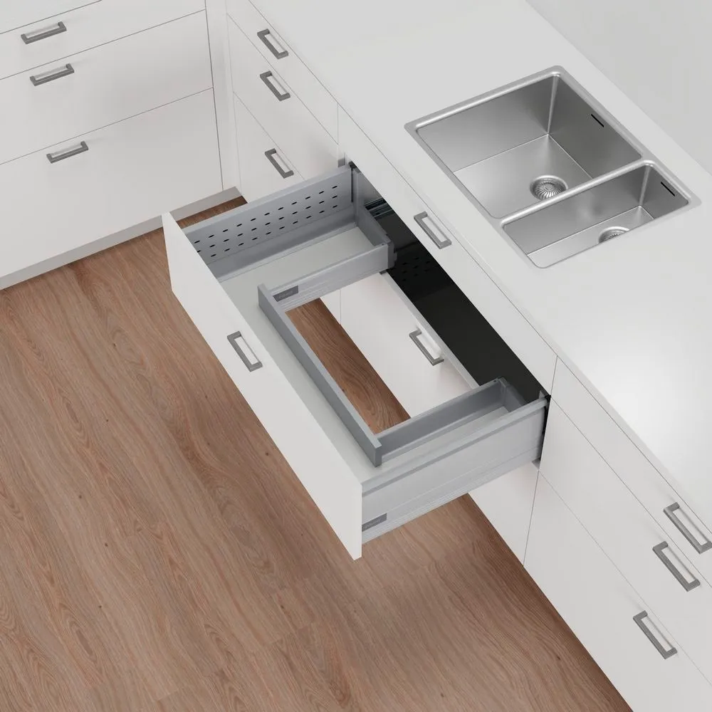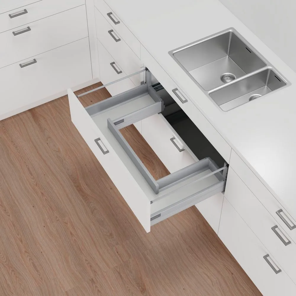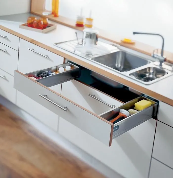 blum 水槽抽能將之前大家所忽略的水槽左右側的空間轉化為存儲空間一一用於釋放清潔劑和清潔用具,能將洗碗所需的東西放在水槽下面的抽屜中隨時取用。