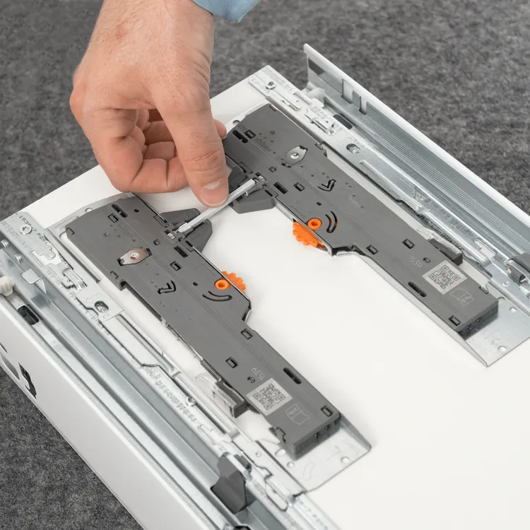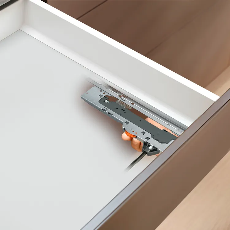 無把手傢具在未來的設計中,扮演越來越重要的角色。blum 最新的拍拍按壓緩衝抽滑軌,結合了方便開啓的TIP-ON 按壓功能及可靠的BLUMOTION靜音緩衝效果,不僅兼具設計及實用性,更為無把手傢俱創造了一個合諧及良好的使用經驗。此產品為100%機械開啓裝置搭配關閉緩衝效果,特別適用於無把手家具,不論是設計於廚具、浴櫃、客廳,皆能為您創造極簡的高品質傢具風格。