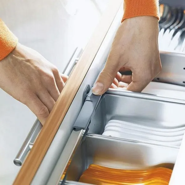 專為 blum TANDEMBOX內抽設計的專用把手,提供穩定且順手的開啟方式,提升內抽使用便利性與操作舒適度。另有可搭配連動機機的配合扣件,讓您可以外抽打開連動內抽一起開,也能分開操作,整體使用感更順暢。 應用範例